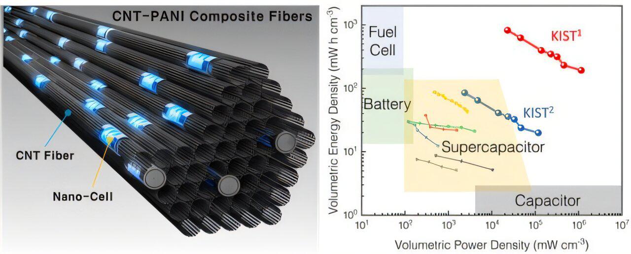 车联智感讯 据外媒报道,韩国研究团队开发出一种高性能超级电容器,有望成为下一代储能设备。该技术的细节发表在期刊《Composites Part B: Engineering》,研究人员利用由单壁碳纳米管(CNT)和导电聚合物聚苯胺(PANI)组成的创新纤维结构,克服了现有超级电容器的局限性。与传统电池相比,超级电容器充电速度更快、功率密度更高,并且在数万次充放电循环中性能衰减更小。然而,其相对较低的能量密度限制了其长期使用,这限制了其在电动汽车和无人机等实际应用中的应用。