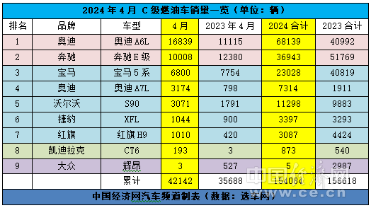 今年前4个月,燃油车的销量之和为154084辆,与去年同期的159177辆相比下滑3.2%,在C级车总销量中的占比为59.28%;新能源车的销量之和为105851辆,与去年同期的100144辆相比增长5.7%,在C级车总销量中的占比为40.72%。