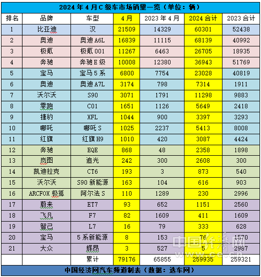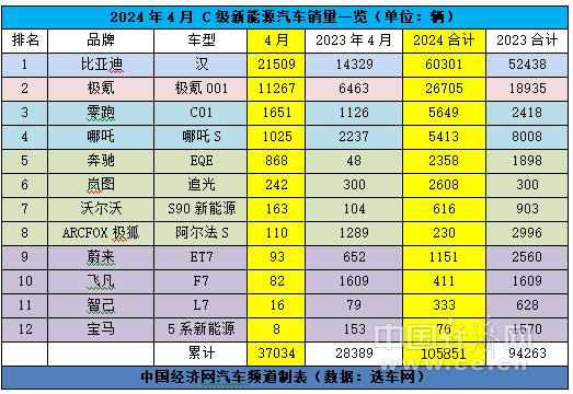 与比亚迪汉采取同样市场策略的极氪001,在4月以超万辆的成绩,成功杀入C级车市场的头部阵营。“如果极氪001的月销量稳定万辆以上,就能与比亚迪汉一道构建起自主新能源抗衡合资燃油车的C级车市场格局,”有业内人士说。