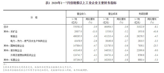 1-7月,全国规模以上工业企业实现营业收入55.06万亿元,同比下降3.9%;发生营业成本46.49万亿元,下降3.6%;利润总额31022.9亿元,同比下降8.1%,降幅比1-6月收窄4.7%。在41个工业大类行业中,12个行业利润总额同比增加,29个行业减少。