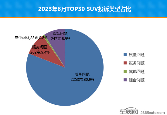 据乘联会提供的全国汽车产销数据显示,2023年8月份国内SUV市场累计零售销量93.1万辆,环比上涨2.8%,同比上涨11.4%。同期,车质网受理车主针对SUV的有效投诉8,871宗,环比下降约3%,同比下降3.9%。去除投诉人自愿申请撤诉的信息后,2023年8月TOP30 SUV销量投诉量排名如下: