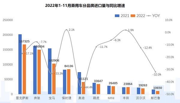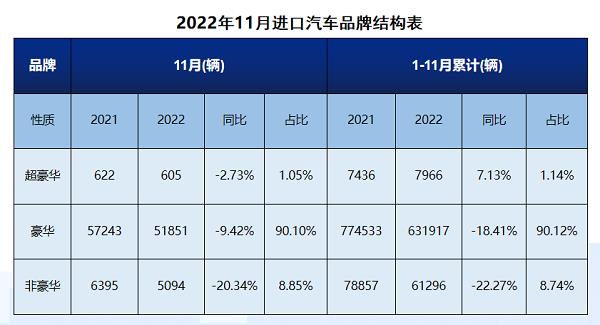 本次月度分析会上,流通协会还对全年进口车细分市场做出预判,预计2022年进口车总体销量将不足80万辆,供给(进口)量在90万辆左右。最新数据显示,2022年1-11月我国进口车销量为70万辆,同比下降18.7%;累计进口81.4万辆,同比下滑7.4%。